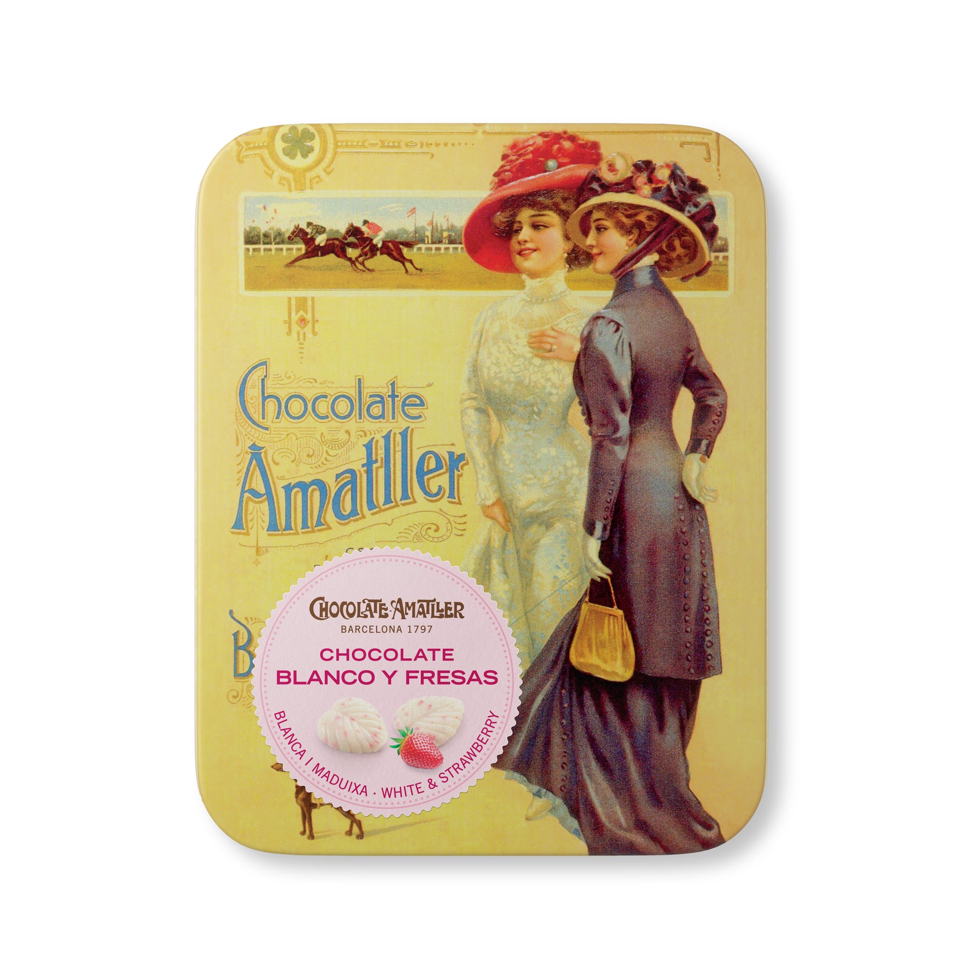 Läckra tunna blad av vit choklad med jordgubb, inuti en plåtask dekorerad med klassiska affischer från märket Chocolate Amatller. Tillverkade enligt den traditionella metoden för urval, rostning, raffinering och konchning. Dessa fina blad kännetecknas av sin intensiva smak som varar länge i munnen med en rostad ton.