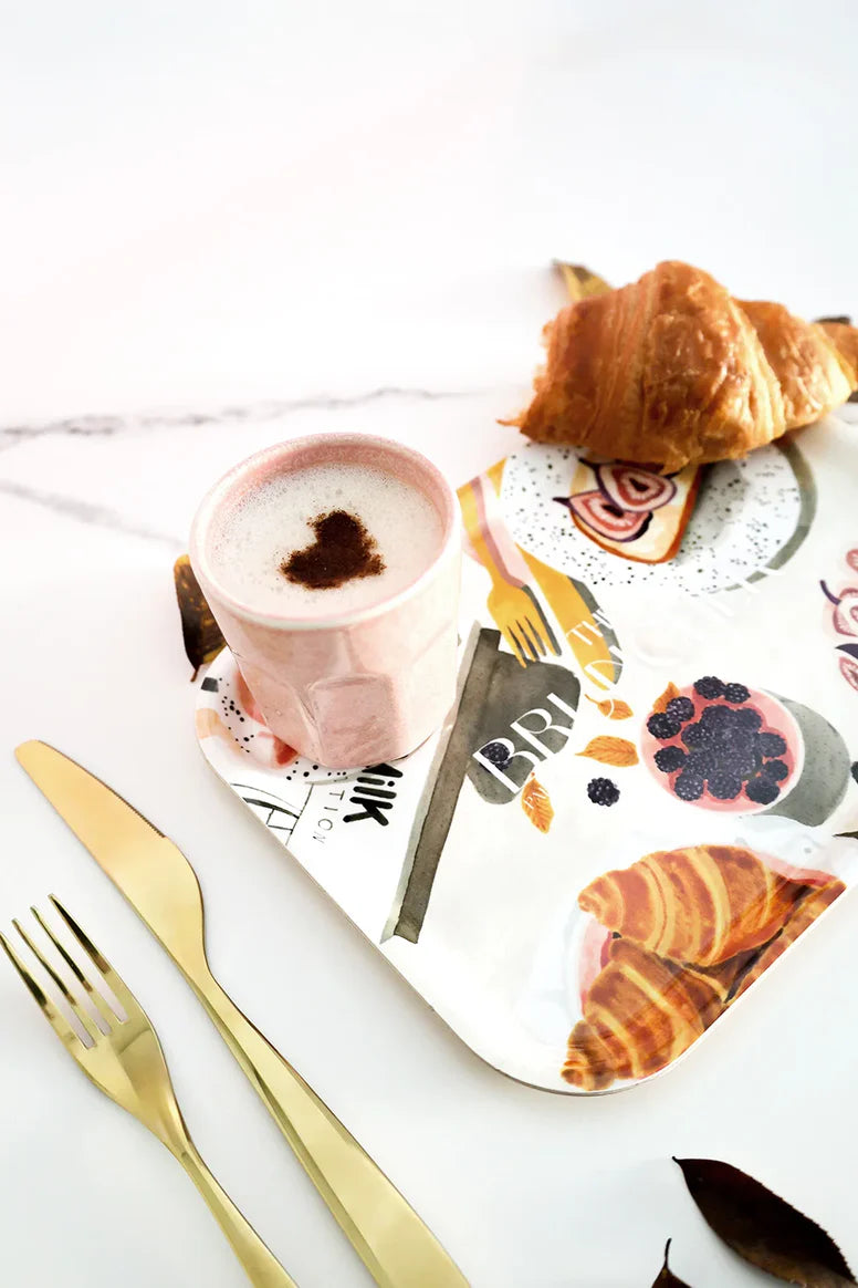 Lagom stor frukostbricka laminerad i björkfanér. Tillverkad på Öland. Motiv med brunch.