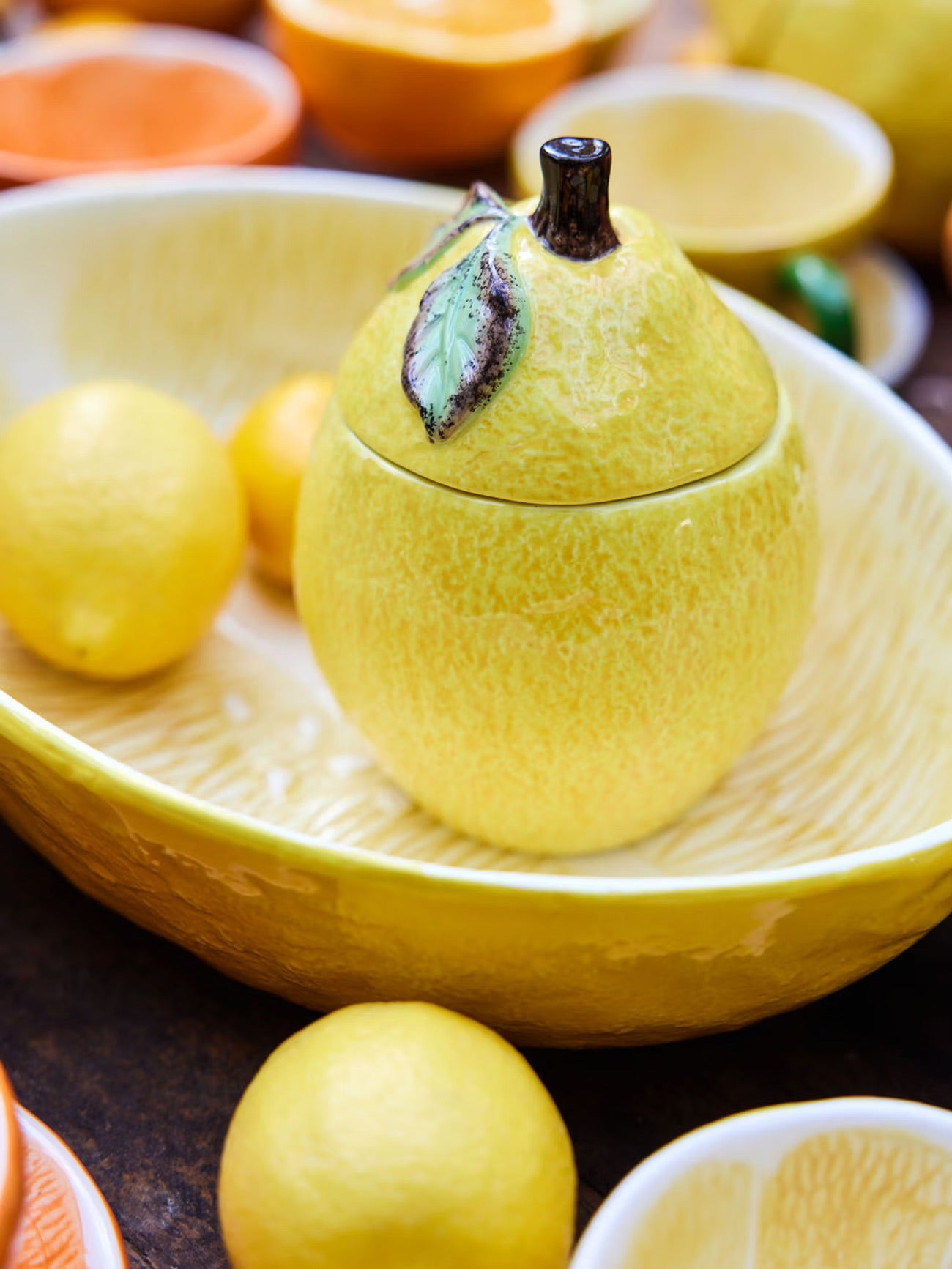 Citroner i porslin ger oss nästan samma vitamininjektion som om man smakar dem på riktigt. Denna citronskål med lock är för allt du vill gömma men ändå ha framme. En extra energikick som passar fint med övriga frukter i Byons sortiment.