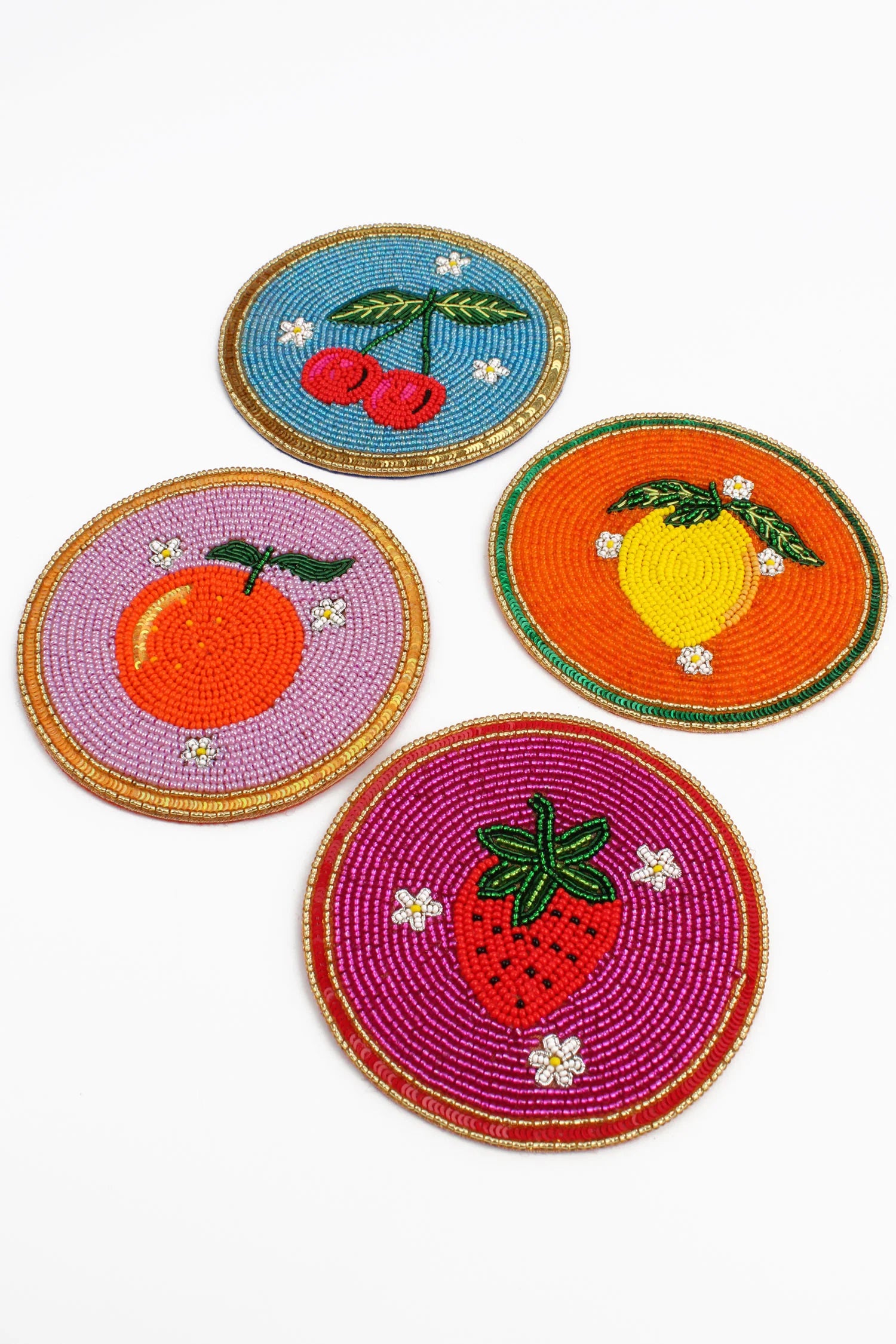 Ljuvliga underlägg till glas eller drinken med motiv av olika frukter. Broderade för hand med glaspärlor i fyra olika färgställningar.