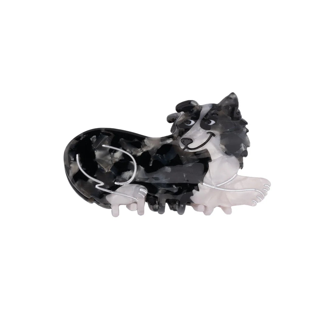 Ett fint svartvitt hårspänne med grafisk design och acetattänder, en hyllning till border collien, den där hunden lika hyperaktiv som elegant, med sitt långa silkeslena hår som flög i vinden under sina frenetiska löprundor i skogen! Men den här har helt klart valt en tupplur istället.