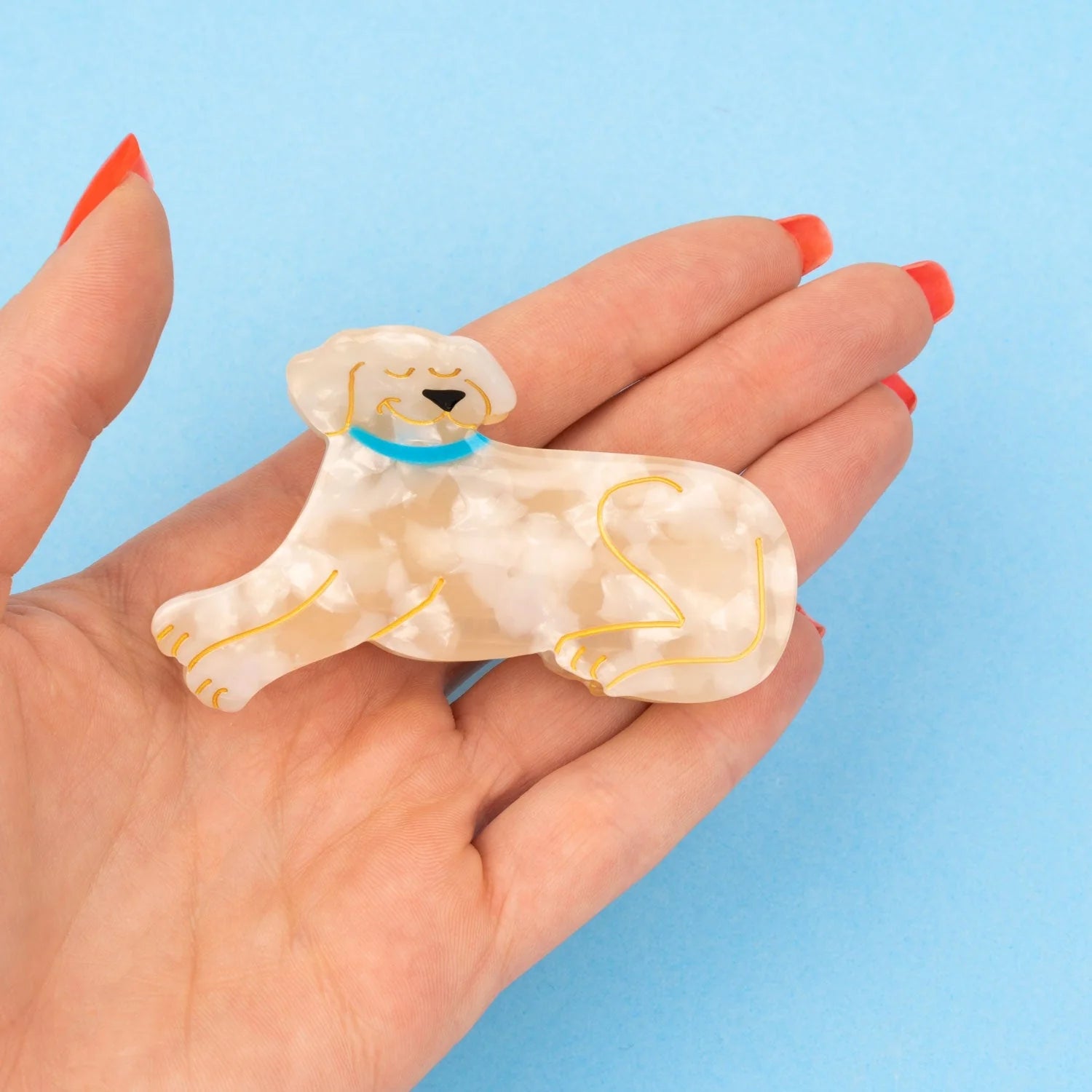 Golden retrievern, en av människans bästa vänner! Vuxna och barn älskar dess hjälpsamma och lekfulla personlighet. Att bära en golden hårklämma innebär inte bara att ha en snygg frisyr, det är också ett perfekt sätt att aldrig gå ut utan sin bästa vän.