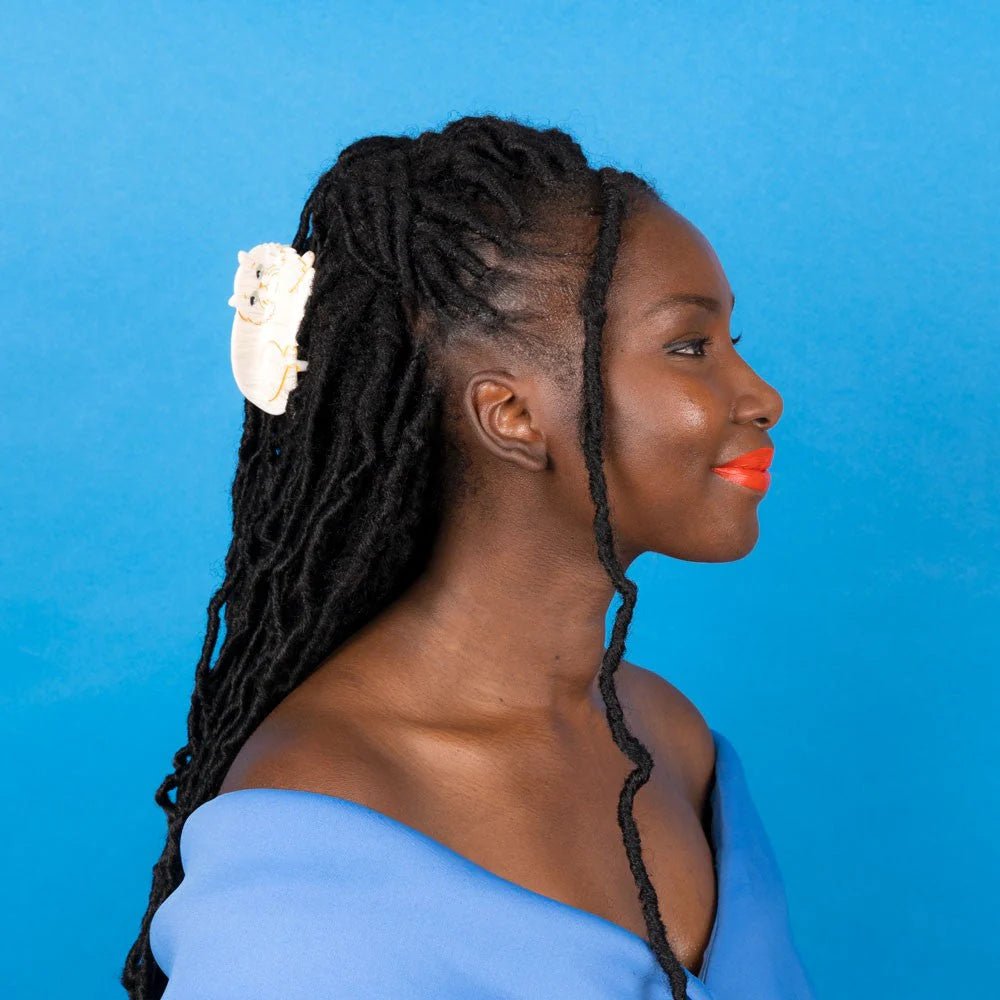 Ett bedårande putande ansikte, stora ljusa ögon och en fluffig päls i överflöd… Vi är helt förälskade i den här lilla persern! Du kommer att märka att det krämfärgade materialet perfekt imiterar den här kattens superfluffiga päls, eller hur? En perfekt accessoar för att skapa originella frisyrer på ett ögonblick.