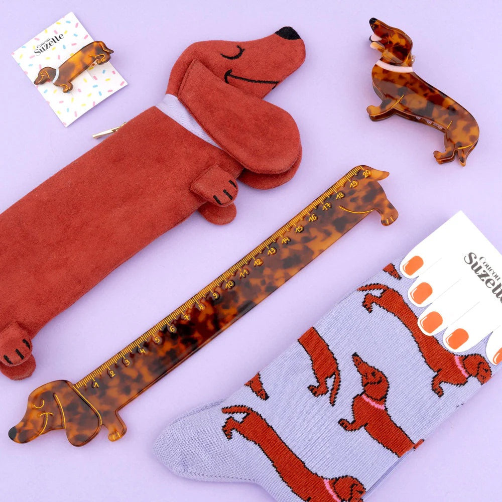 Det allra första pennfodralet från Coucou Suzette! Finns det någon bättre form att börja med än en tax? Med sin korvliknande look är det perfekt att förvara alla dina favoritpennor i. Silkesinsidan och den mjuka lyxiga sammeten på utsidan gör det till det perfekta accessoaren att visa upp i klassrummet eller på jobbet! Vi älskar också dess stora och realistiska dinglande öron. Nu behöver du bara bestämma om du ska köpa det till dig själv eller till barnet ;)