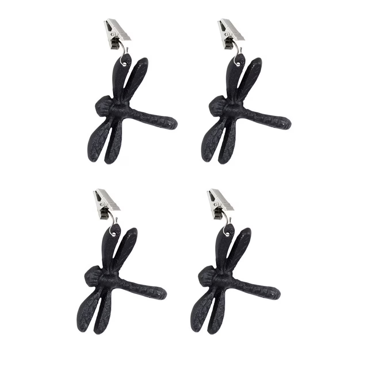 Duktyngder i form av en trollslända som håller duken på plats. Tillverkad i gjutjärn / smide med klämmor i plåt. Bör tas in vid regn för att undvika risken för rost och fläckar på textilier. Förpackningen innehåller 4 stycken tyngder.