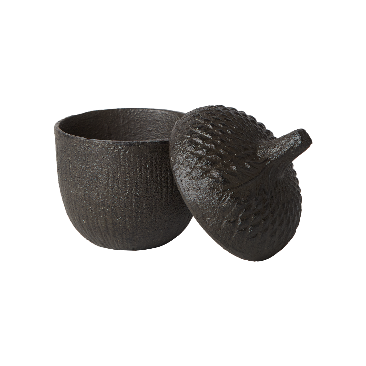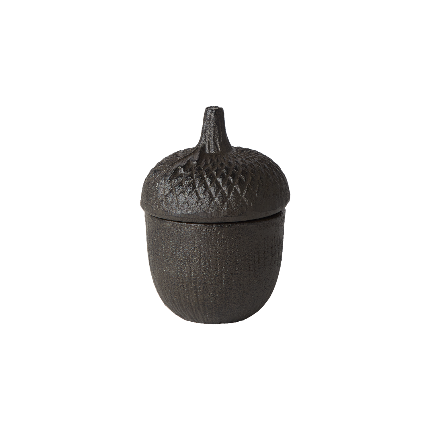 En burk med lock i form av ett ekollon i gjutjärn.