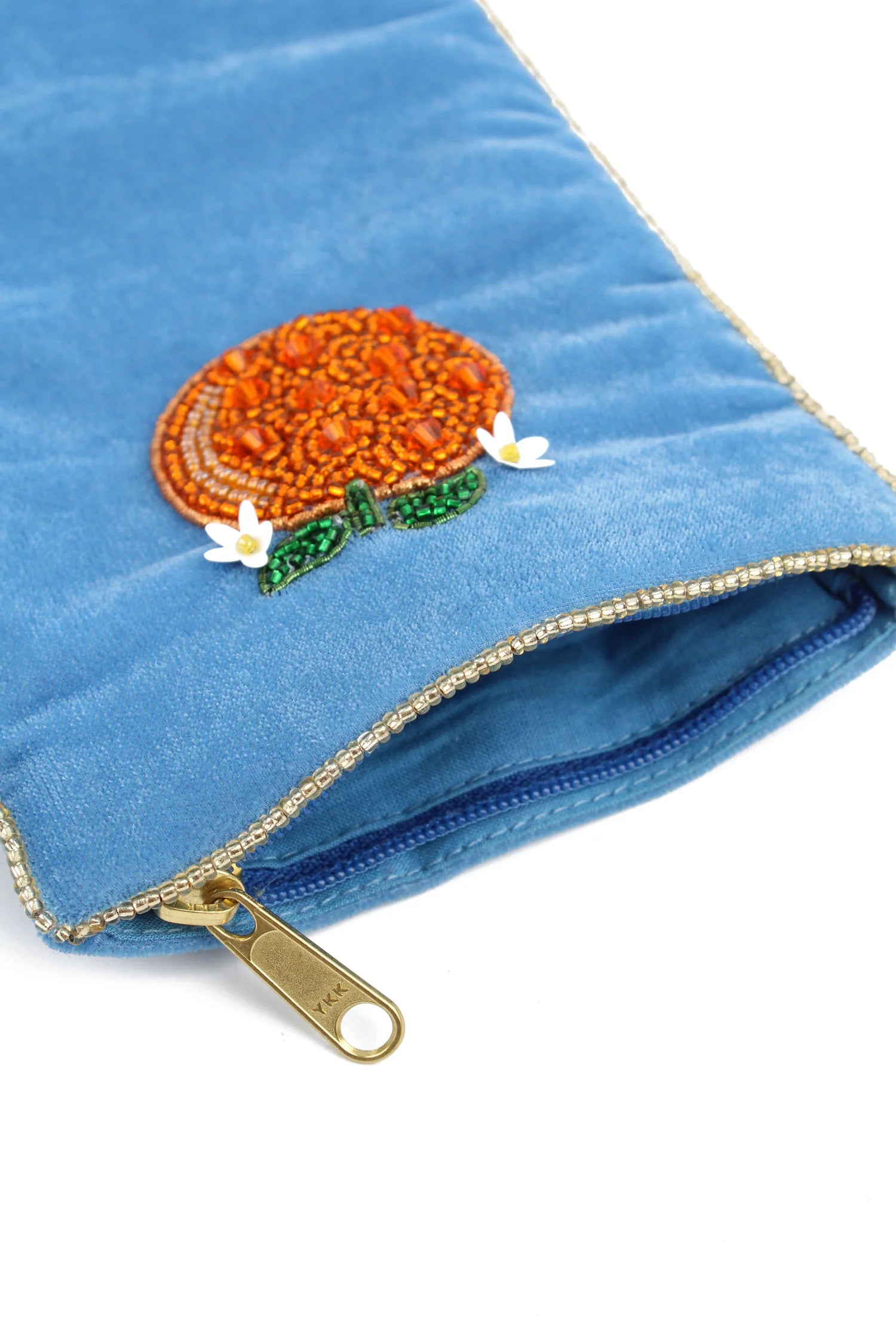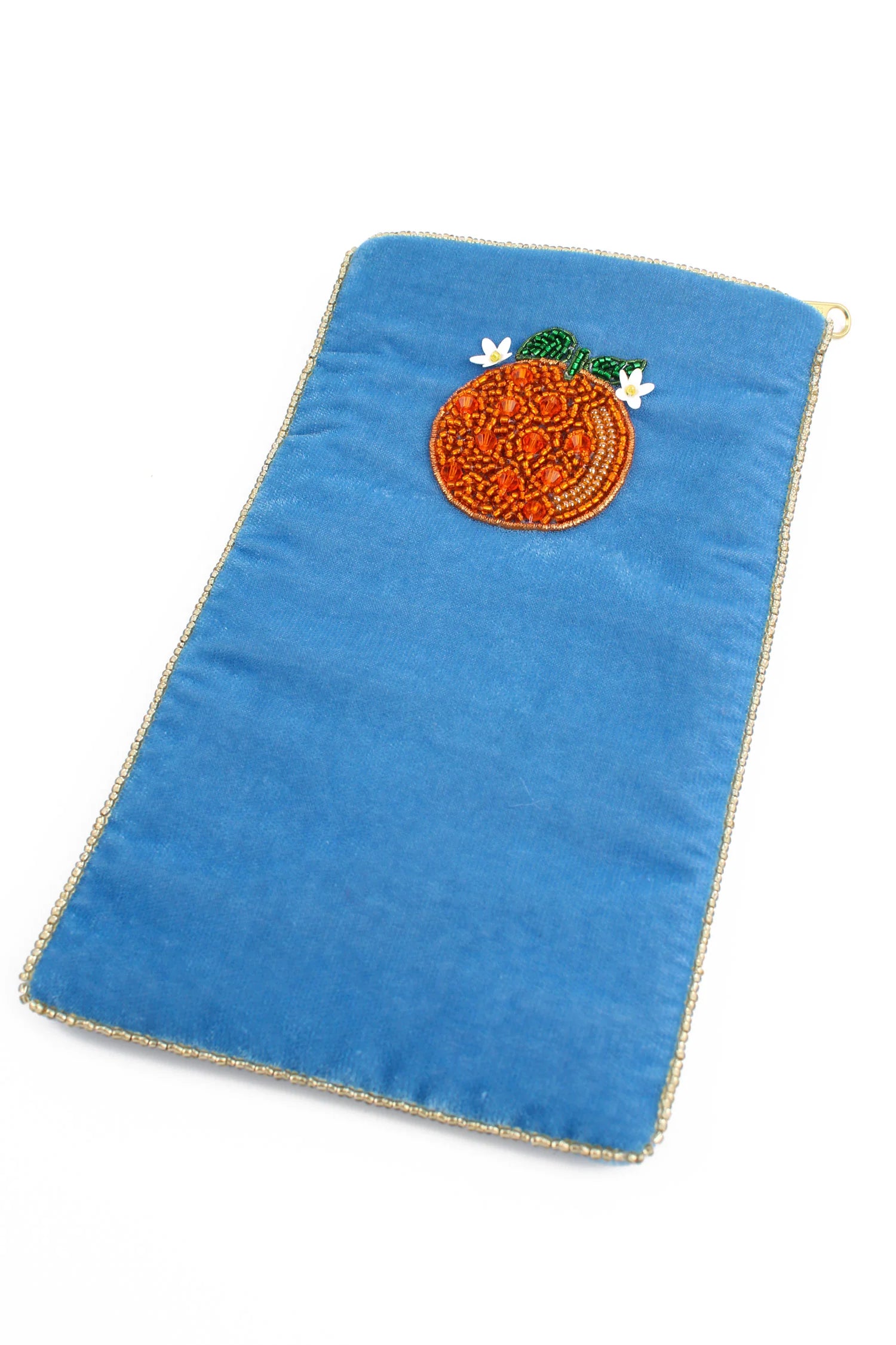 Fodral till solglasögon och glasögon i blå sammet med en apelsin i broderade pärlor. En snygg och användbar accessoar som skyddar dina solglasögon.