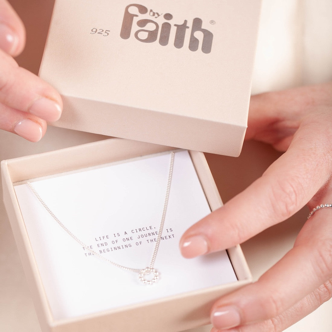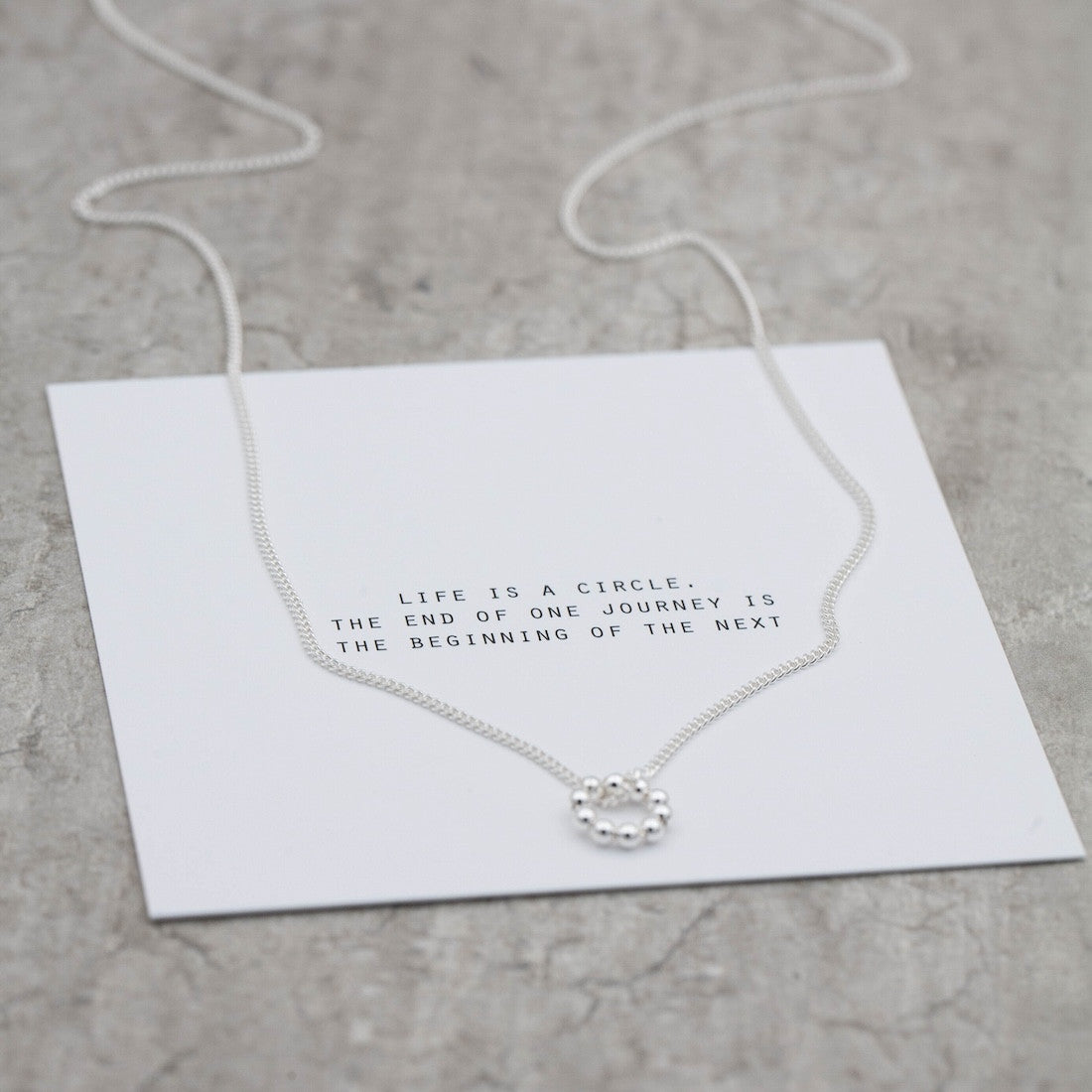 Fin tunn halskedja med cirkel av små silverkulor. Vår cirkel symboliserar livet. En perfekt present till dig själv eller någon du du tycker om. Halsbandet kommer med tillhörande text. "Life is a circle. The end of one journey is the beginning of the next".