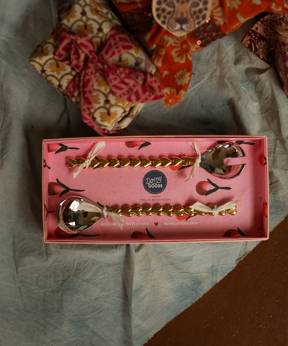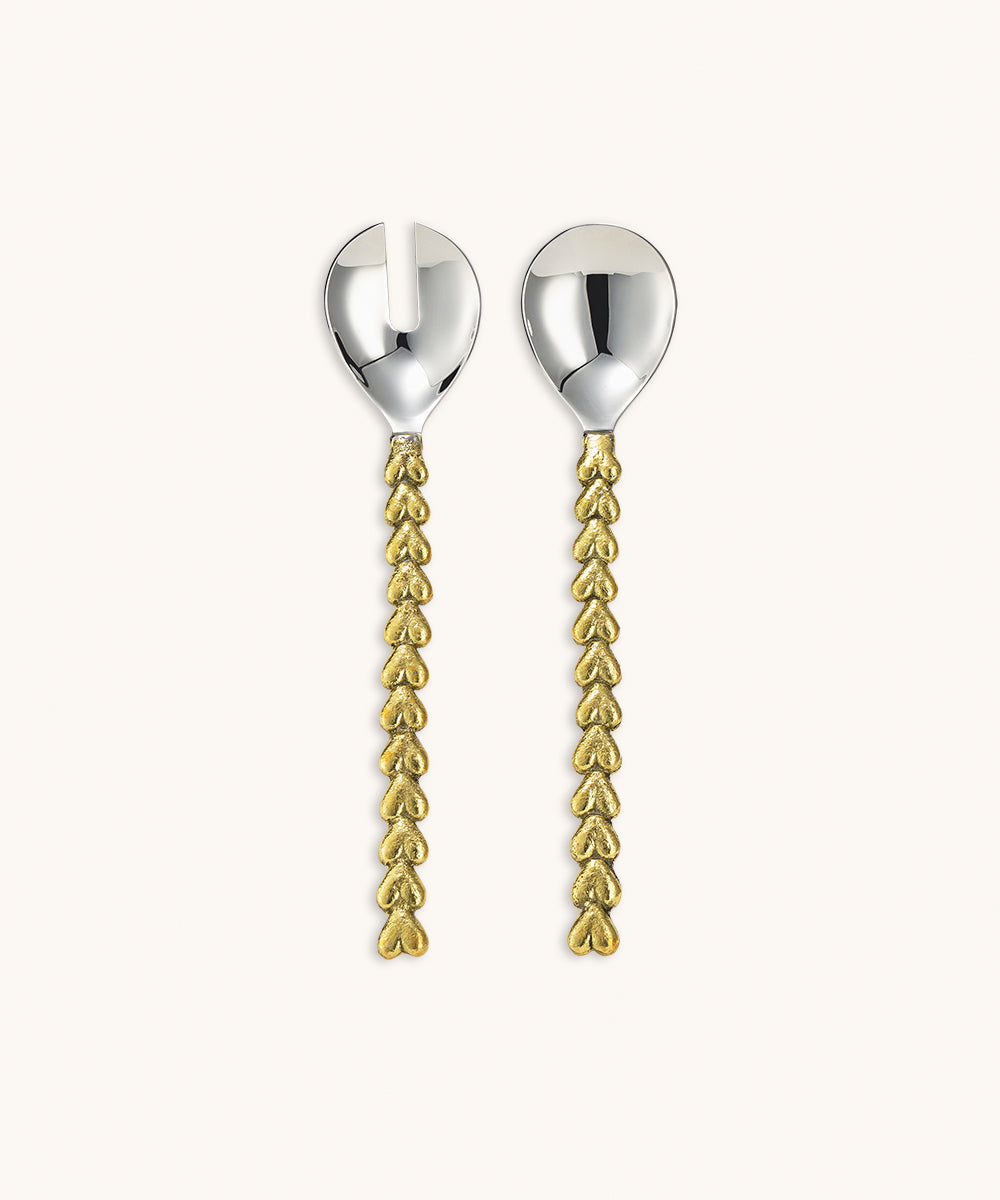 Ge ditt bord en touch av kärlek och elegans med Holly Heart-salladsbestick. Detta speciella set är handgjort av återvunnen mässing och högkvalitativt rostfritt stål. Handtagen är vackert dekorerat med en rad små hjärtan i en varm gyllene finish – en subtil detalj som gör att varje måltid känns lite mer speciell.