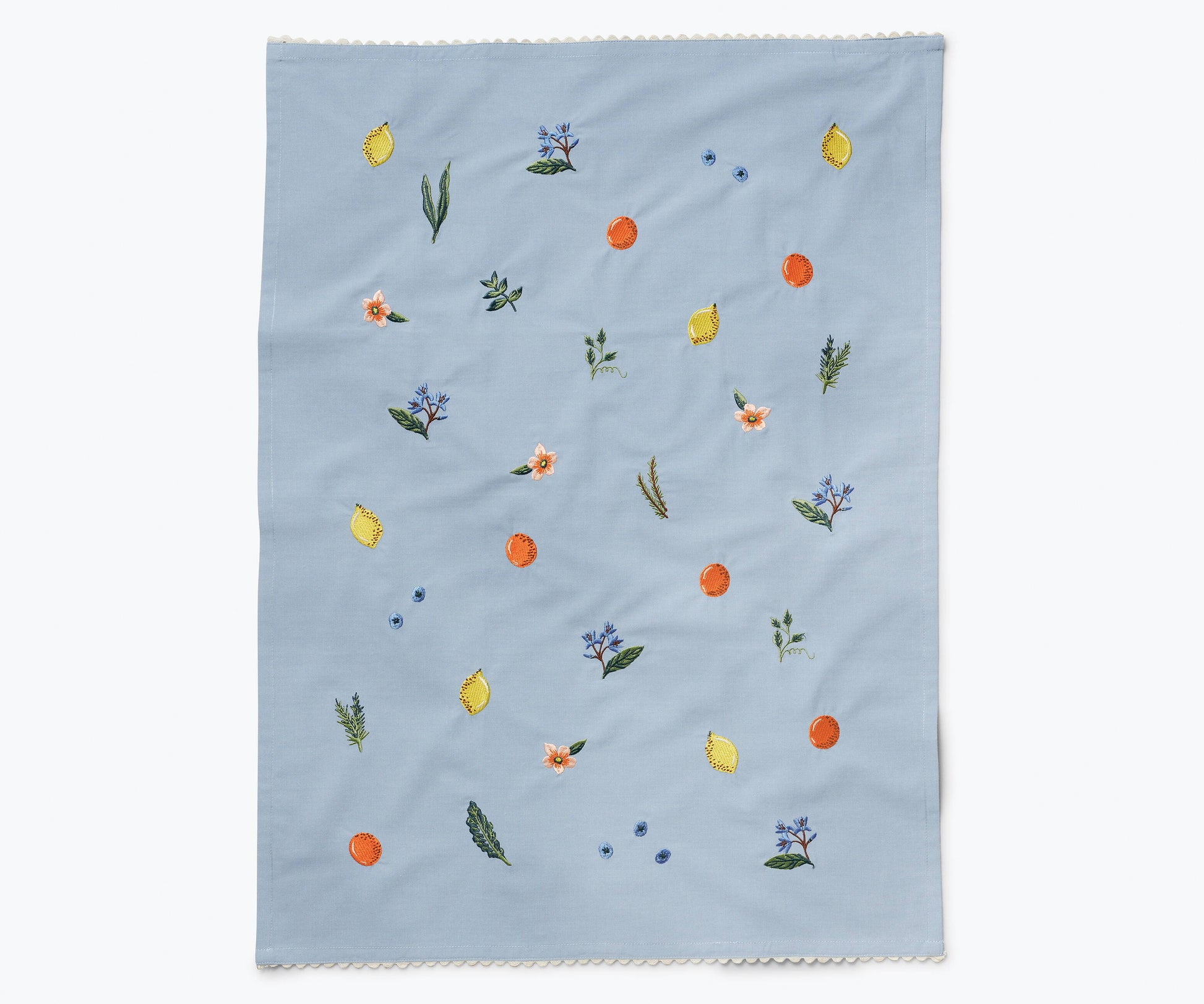 Ljuvlig kökshandduk från amerikanska Rifle paper & Co. med broderade citroner, apelsiner och blommor.