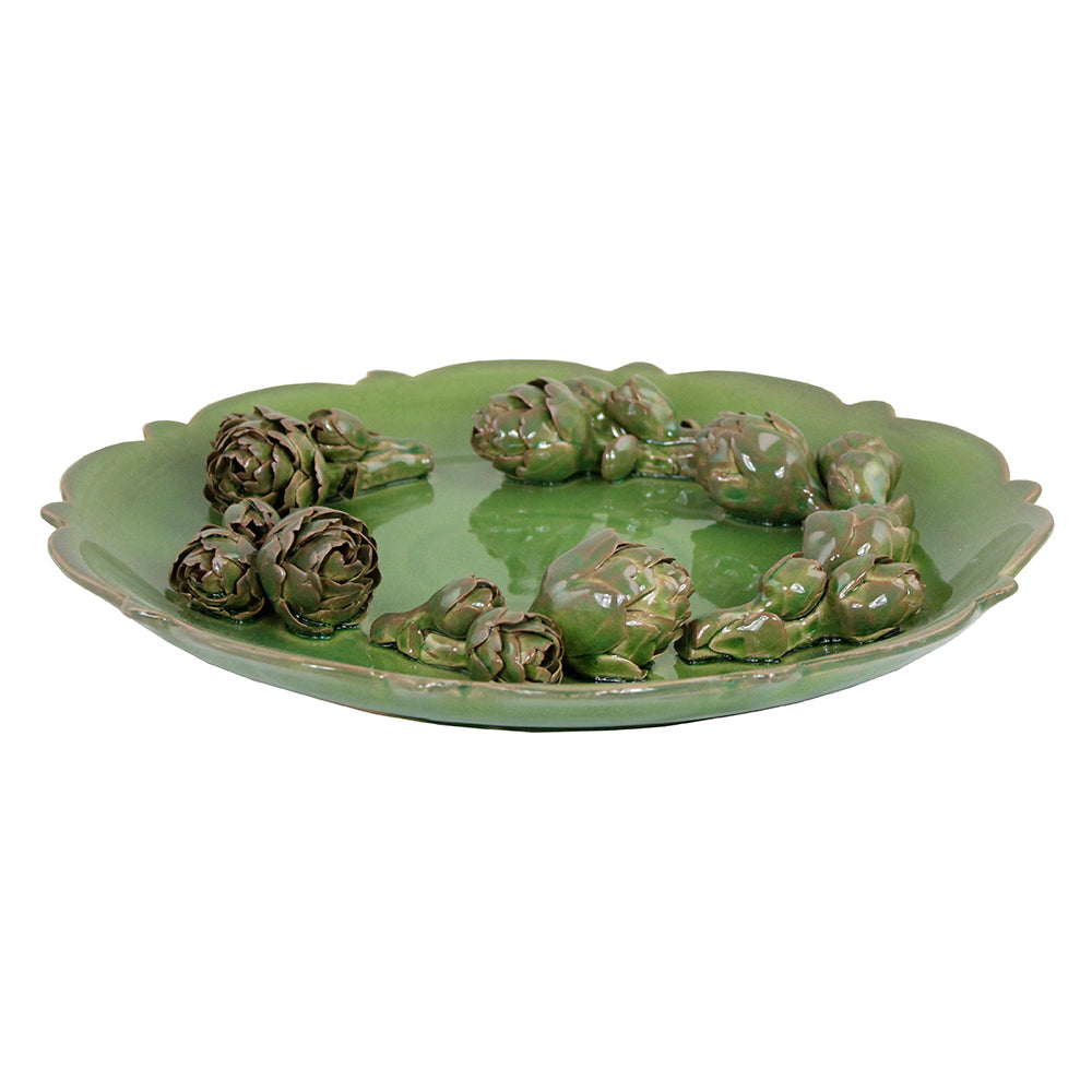 Vackert glaserat grönt fat med kronärtskockor. Fint som det är och bara ha framme som en inredningsdetalj eller att servera på.
