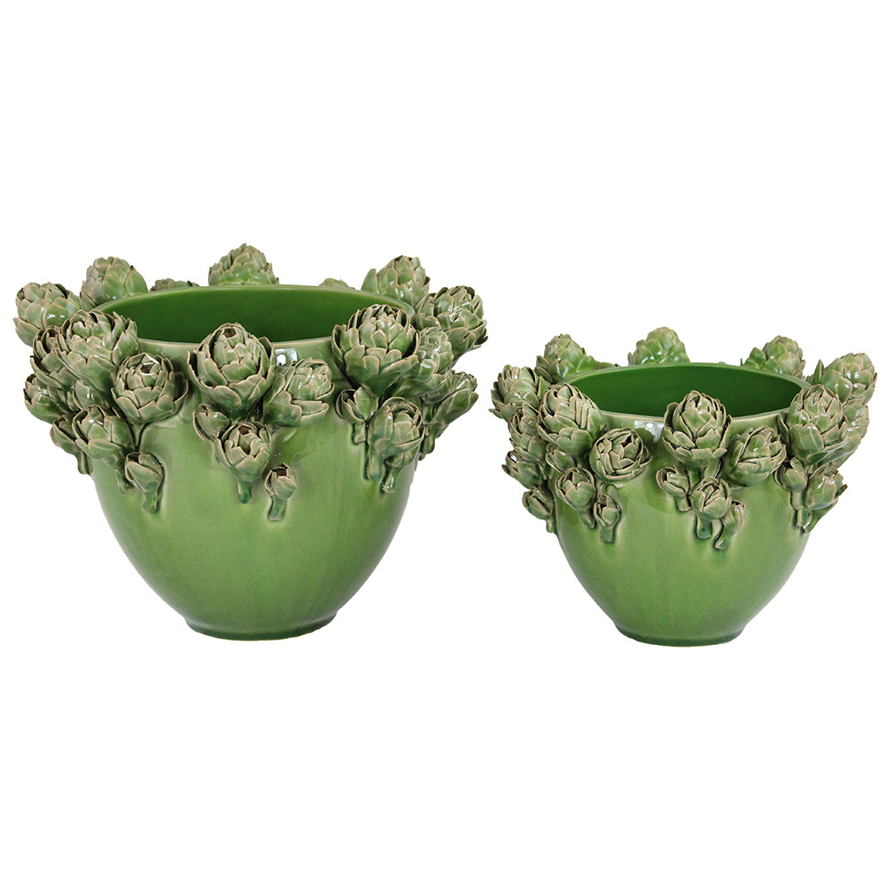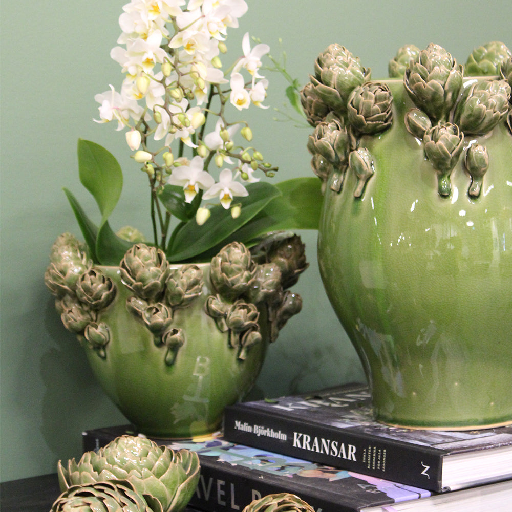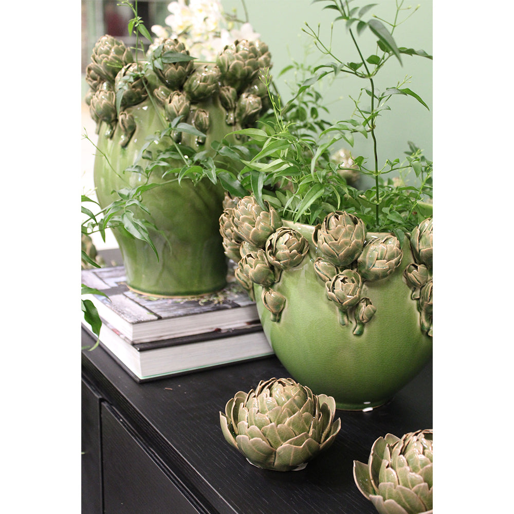 Vackra glaserade gröna krukor med kronärtskockor. En fin detalj i hemmet, antingen med växt i eller så är den lika fin som den är.
