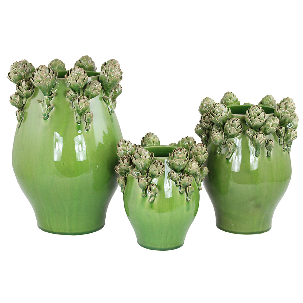 Vackra glaserade gröna vaster med kronärtskockor. En fin detalj i hemmet, antingen med växt i eller så är den lika fin som den är.