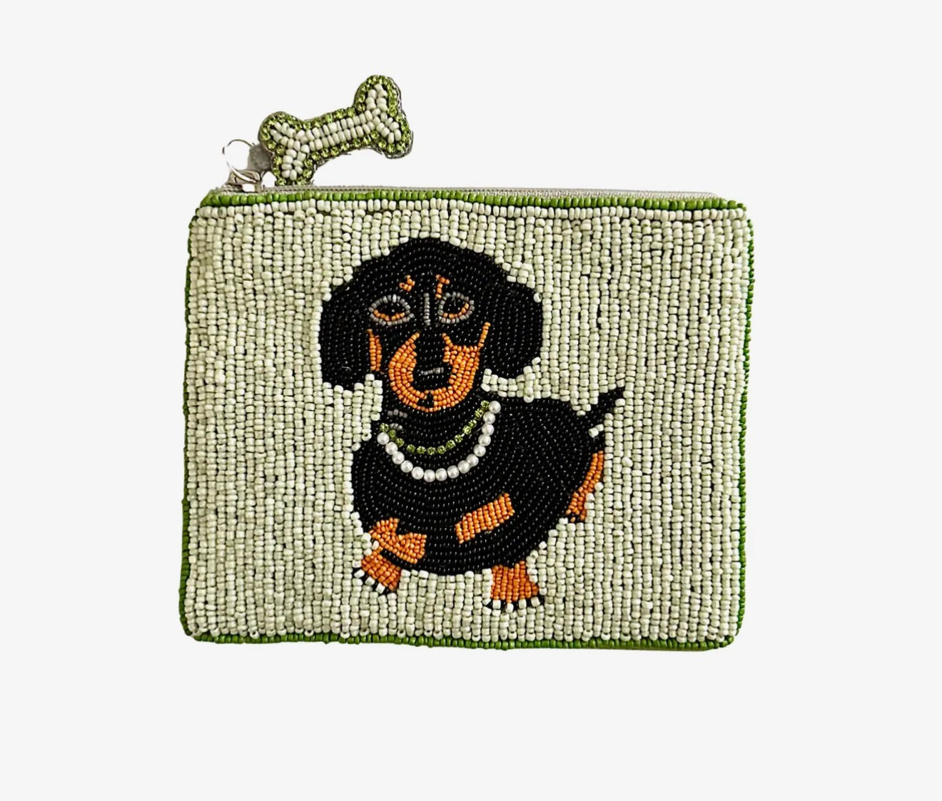 Söt liten väska att använda som necessär, till mynt eller som förvaring till läppstift, spegel etc. Perfekt att ha småsaker i till den större väskan. Med ljuvligt taxmotiv av pärlor som är fastsydda för hand. Varje necessär är handgjord och unik vilket är charmen. Grönt tyg i bomull på baksidan. Den är fodrad och vadderad för att skydda innehållet.
