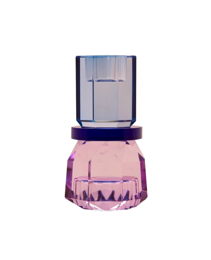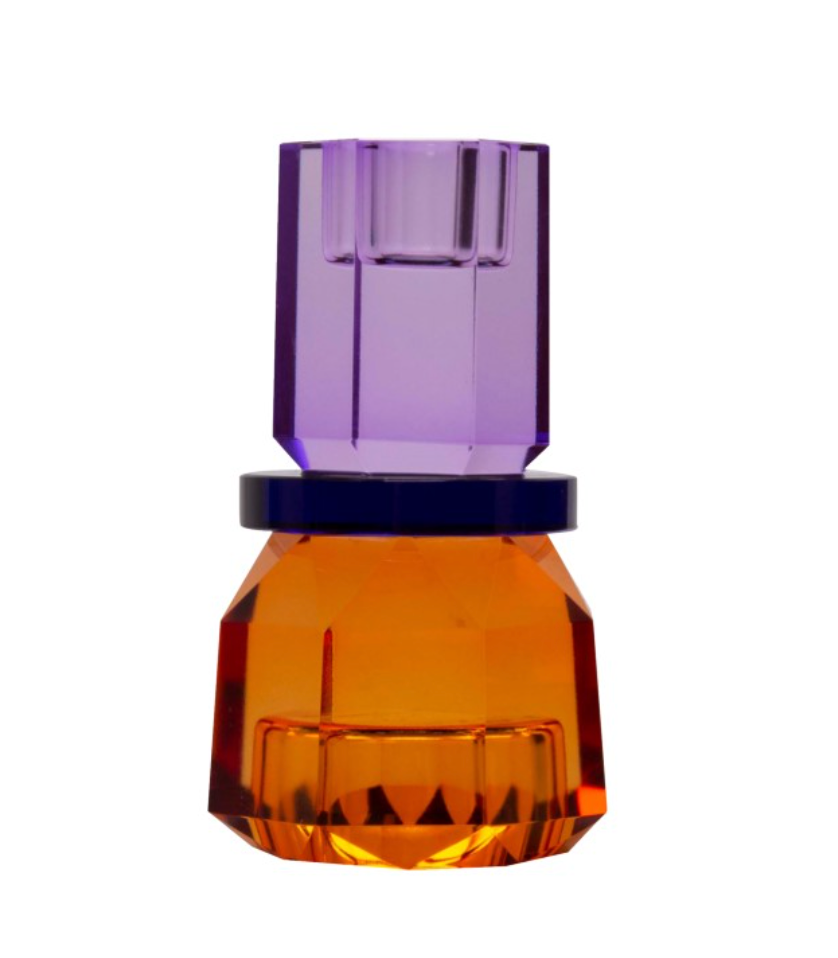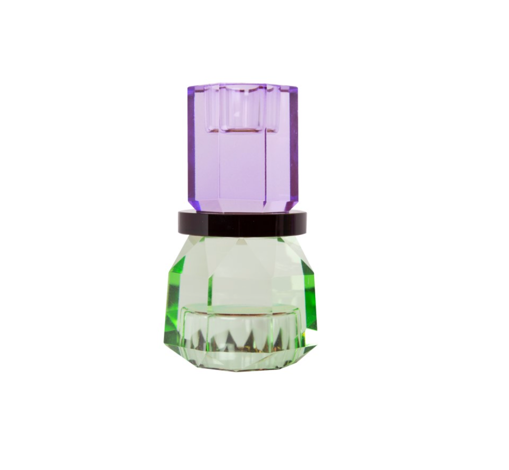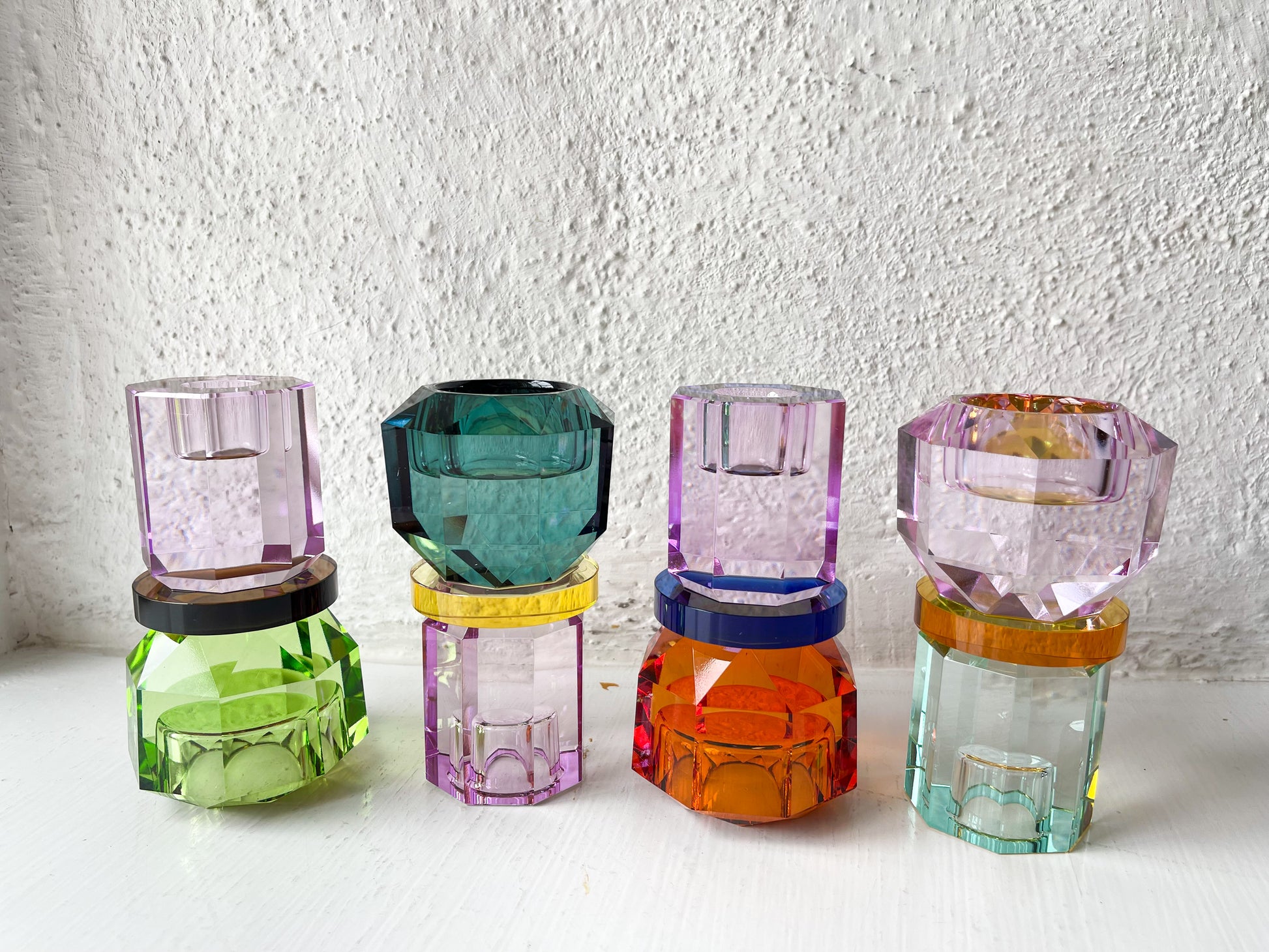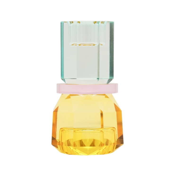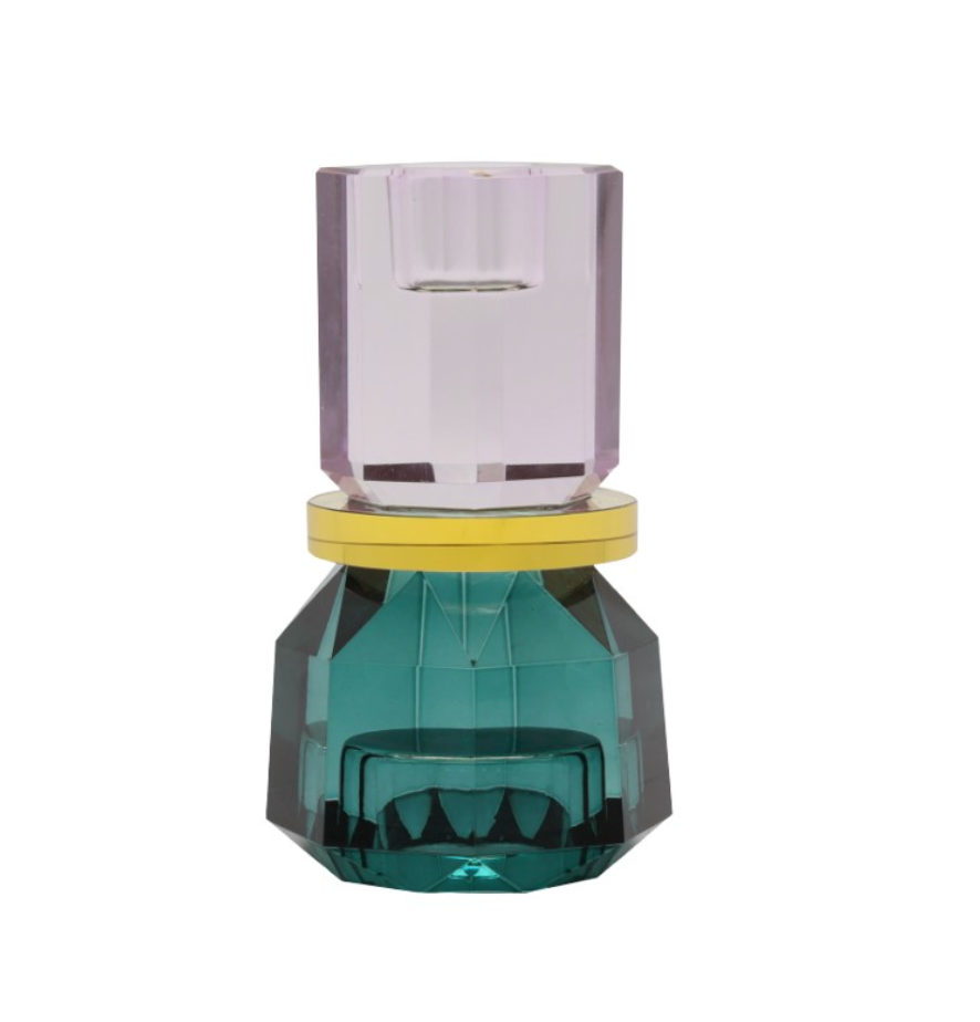 Ljusstake i glas i olika färger. Kan användas för både stearinljus och värmeljus. Kan vändas och användas på båda hållen. Från C'est Bon. Den är tung och känns riktigt lyxig, glaset skimrar fint i solljuset!