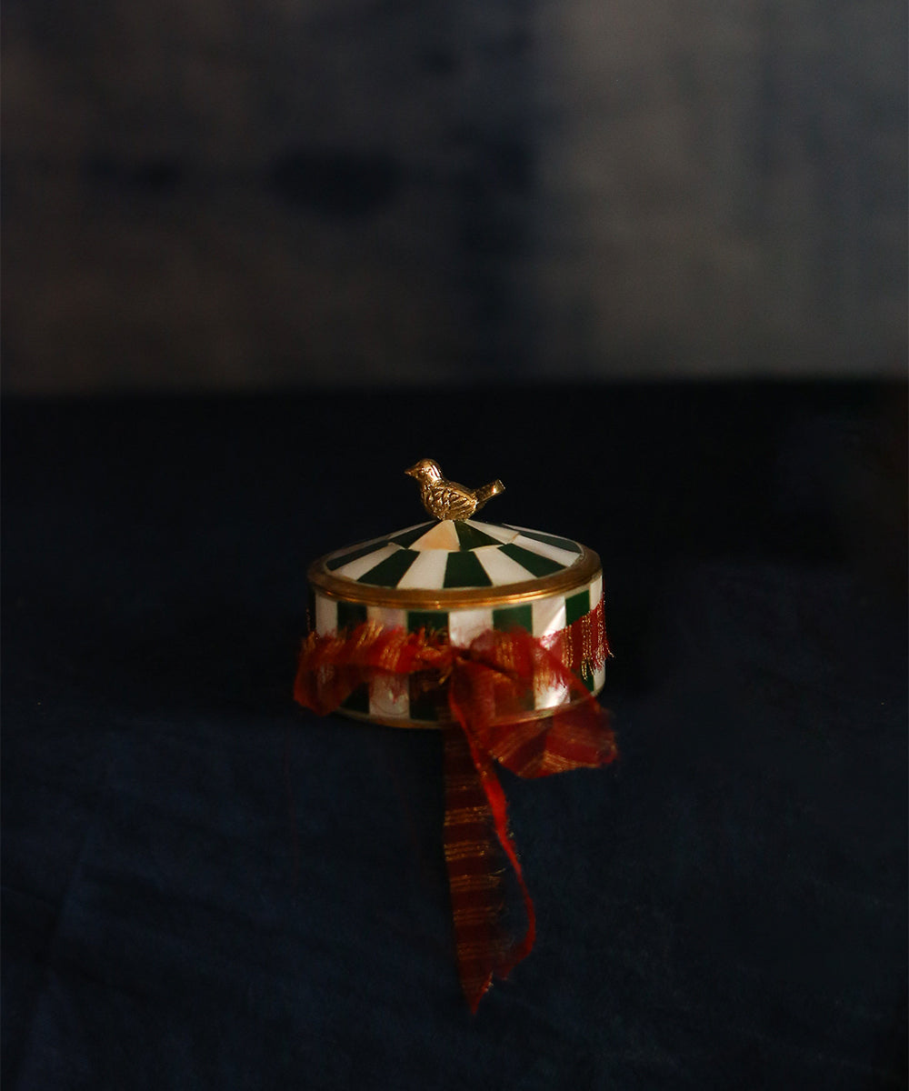 Varje ask är noggrant handgjord av skickliga hantverkare, vilket gör varje ask unikt. Mässingslocket är toppat med en elegant fågelformad knopp som blir en söt och personlig detalj. Små variationer i färg och textur återspeglar den hantverksmässiga karaktären hos detta föremål.