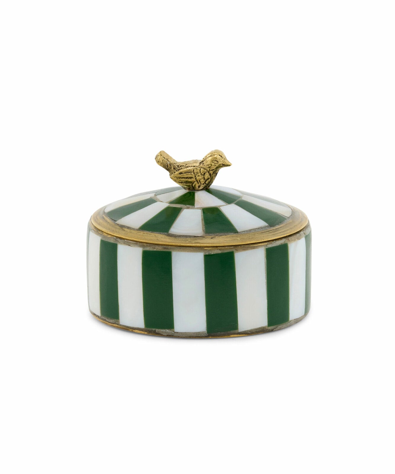 Handgjord av 60 % återvunnen mässing, 25 % naturligt snäckskal och 15 % resin, är denna utsökta ask ett sant smycke för ditt hem. Kombinationen av fylliga gröna toner med det skimrande skimret av snäckskal skapar ett slående randigt mönster som framkallar nostalgisk charm med en modern twist.