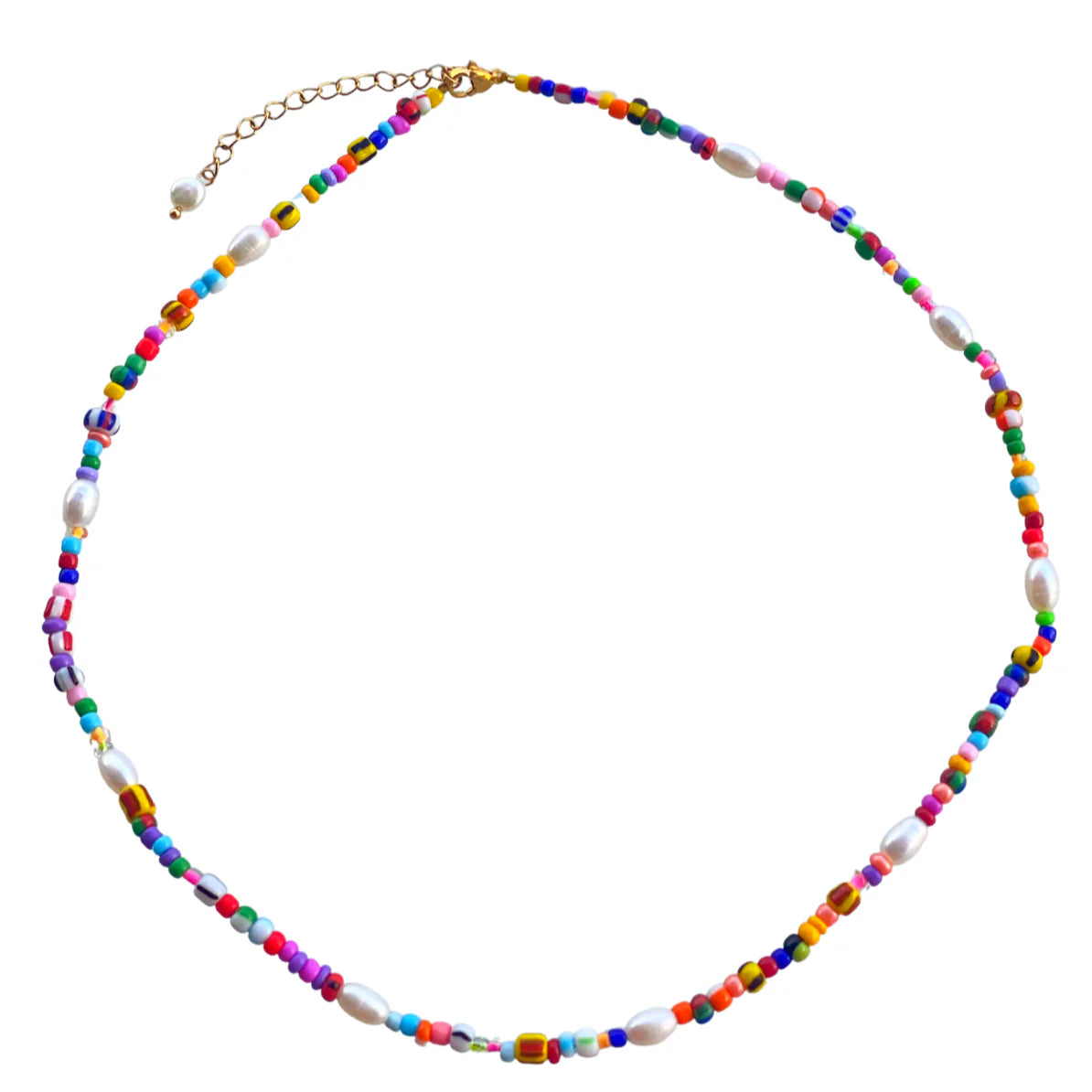Tillverkad av: 18k guldpläterade sötvattenspärlor och färgade glaspärlor