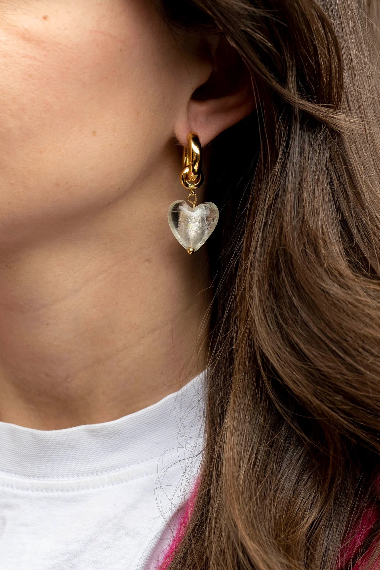 Tillverkad av: 18k guldpläterad mässing med ett vitt hjärta i glas