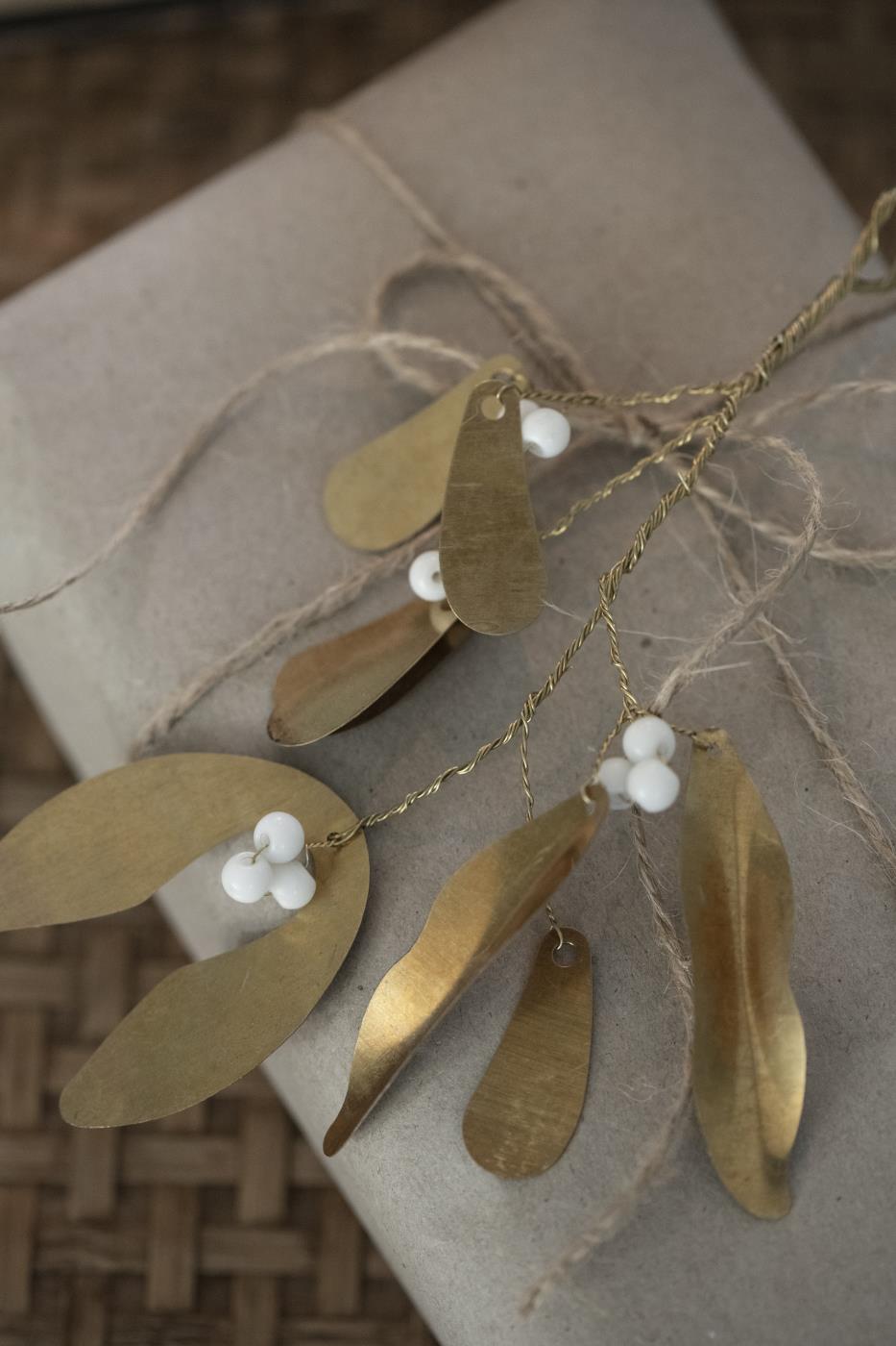 Vackert hänge i mässing som ska föreställa en mistel. Med vita träpärlor. Fin att hänga på en dörr, i fönstret, på skåp eller på en julklapp etc.