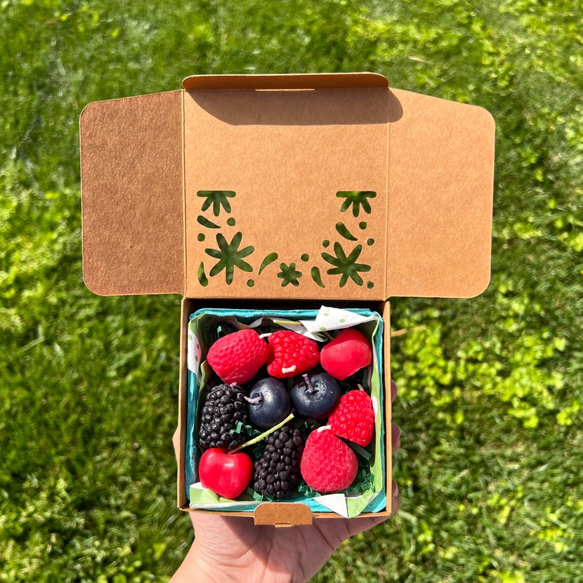 Ljuvliga handgjorda ljus föreställande björnbär, jordgubbar. hallon, blåbär och körsbär i en söt bärask i kartong. Perfekta att sätta på tårtan eller andra bakelser, eller varför inte som present till någon? Ljusen ligger i krusigt papper inuti en återanvändbar bärkorg.