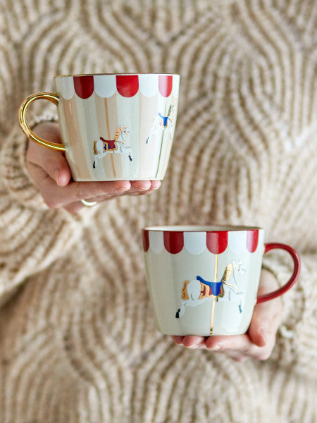 Merry-go-round kopp 30 cl i 2 delar från Bloomingville är ett set med två handmålade koppar i stengods med julinspirerat karusellmönster. En av stengodskopparna har ett vackert guldfärgat handtag som ger extra guldkant på fikastunden. Perfekta för varma drycker under vintern – varje kopp är unik och sprider glädje.
