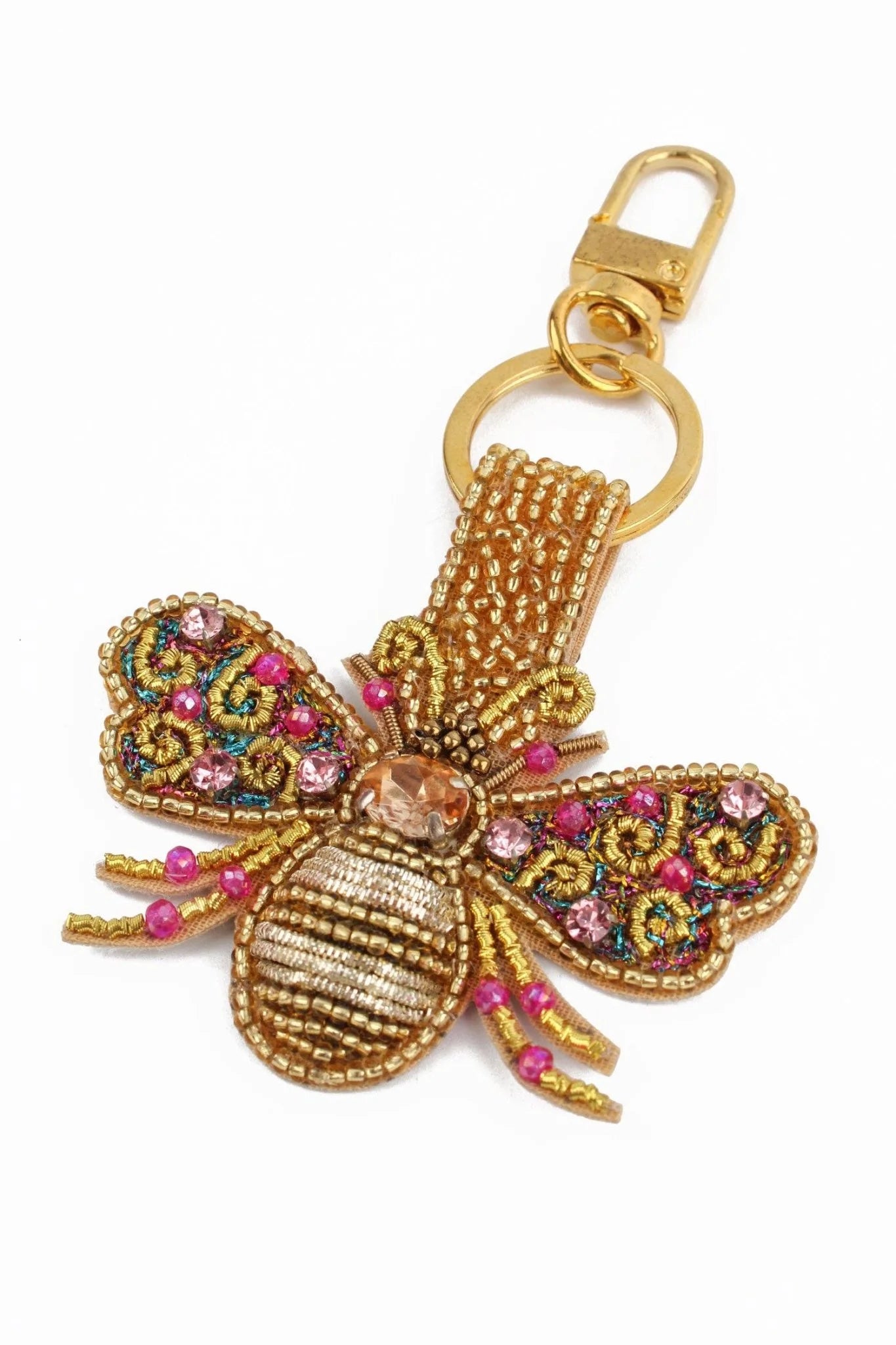 Nyckelring med ett bi i rosa och guld i broderade pärlor. En snygg accessoar till dina nycklar eller en fin detalj att hänga på din favoritväska. Sökord: Bag charm, väsksmycke