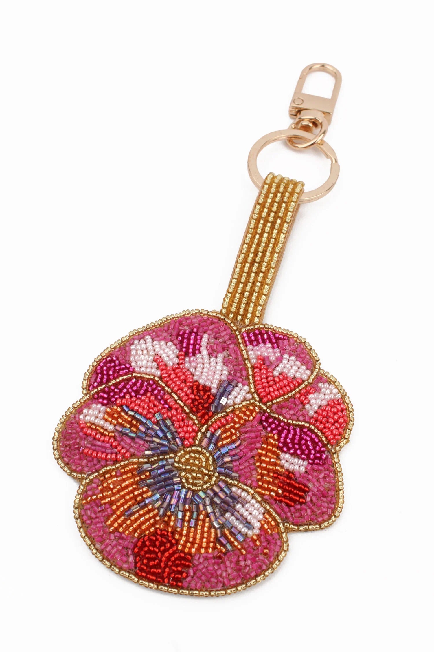 Nyckelring med en rosa pensé i broderade pärlor. En snygg accessoar till dina nycklar eller en fin detalj att hänga på din favoritväska. Sökord: Bag charm, väsksmycke