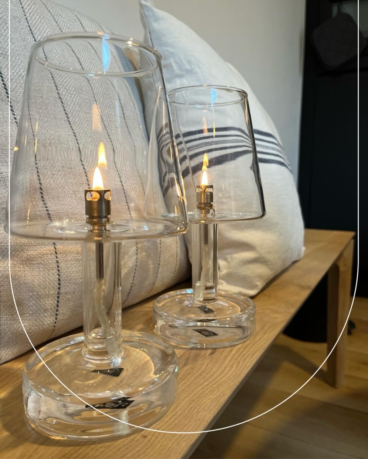 Den här vackra oljelampan är ett elegant tillskott till alla hem. Med sin stilrena och tidlösa design i glas blir den snabbt en stämningshöjare i rummet. Lampan är utrustad med en glasfiberveke som inte behöver bytas, då den endast leder lampoljan, vilket gör att du slipper både os och sot som annars uppstår med vanliga värmeljus. Fyll glaset upp till 3/4 med lampolja för bästa resultat.