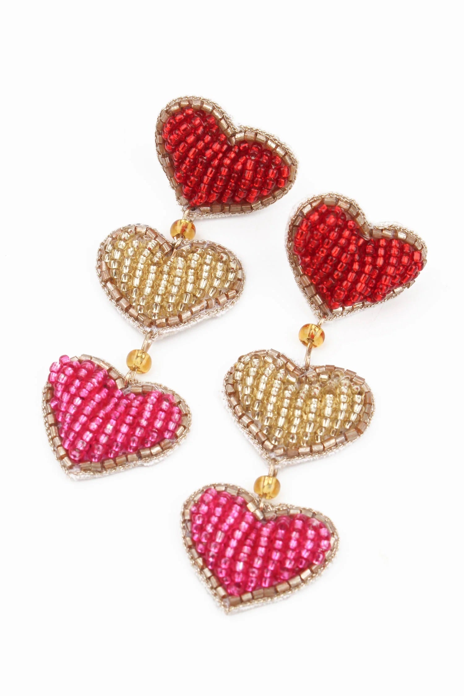 Örhängen med tre hjärtan i rött, guld och rosa med broderade pärlor som garanterat gör succé för din outfit!