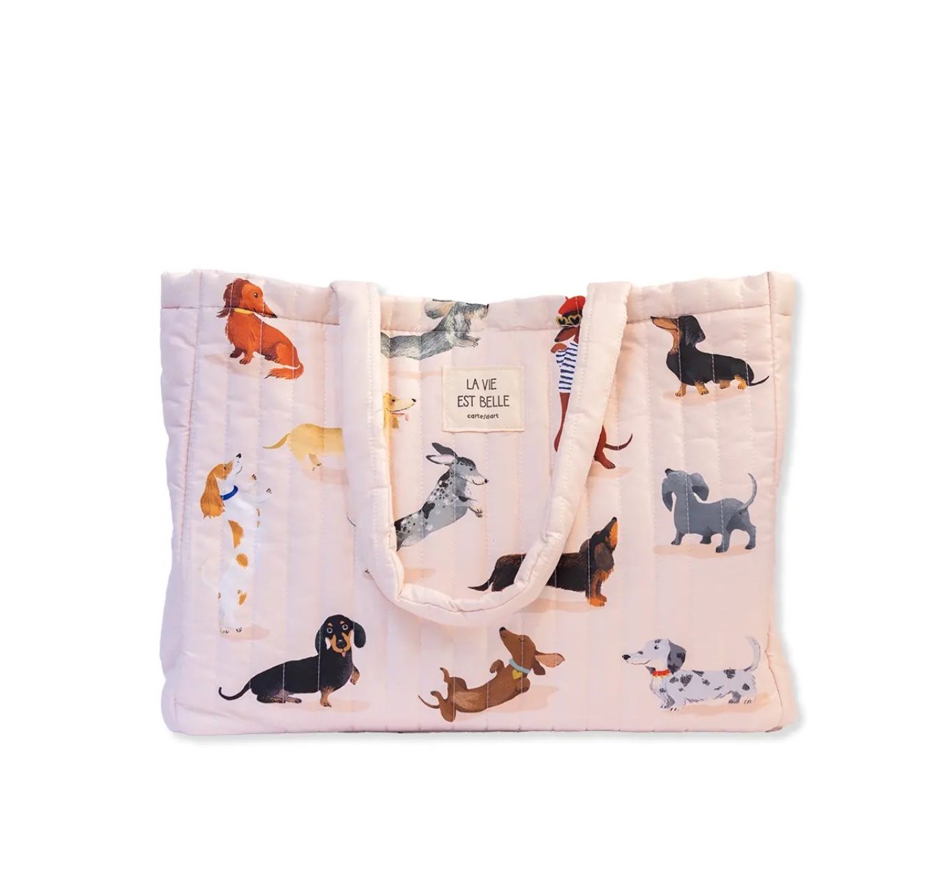 Upptäck våra stora quiltade tygväskor. Den här modellen med våra älskade taxar på en ljust puderrosa bakrund. En stor, otroligt mjuk och bekväm väska för korta semestrar eller stora shoppingrundor! Väskan har en stadig botten och stängd med en magnetisk tryckknapp. Matcha gärna med necessären i samma serie!