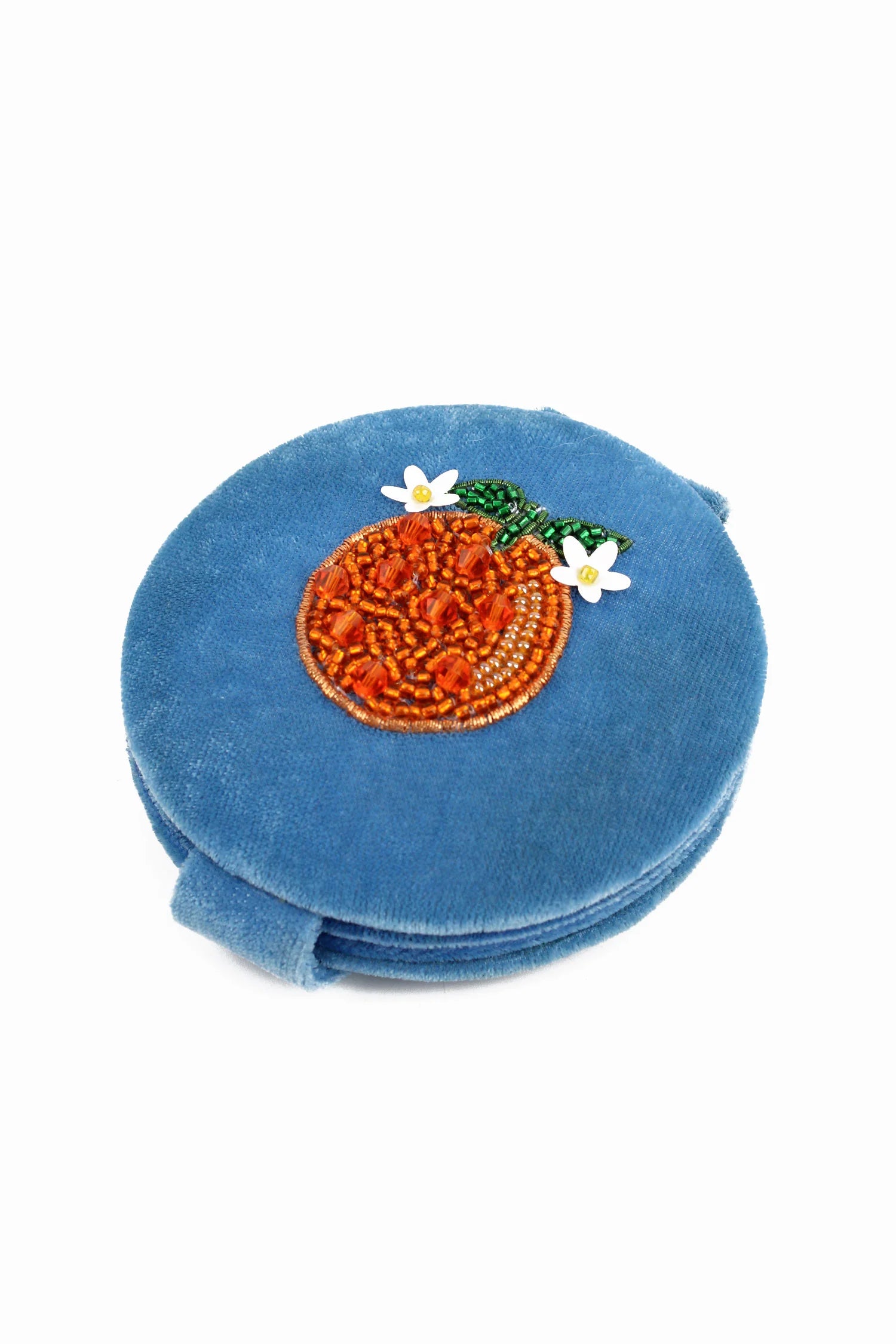 Sminkspegel i blå sammet med en apelsin i broderade pärlor. En snygg och användbar accessoar att ha i väskan när du är på språng eller resa.