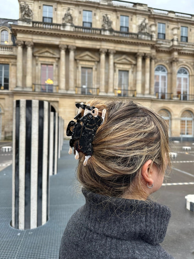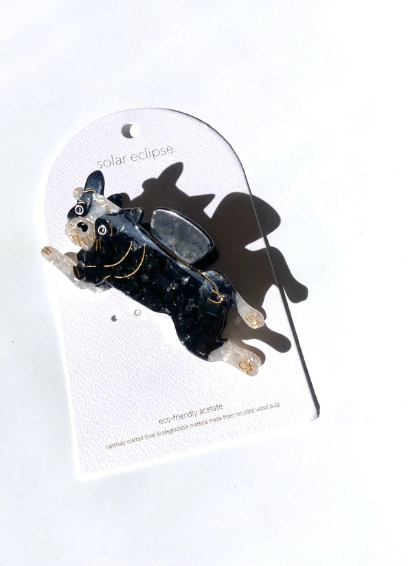 Ge lite glädje till din vardag med en Boston Terrier hårklämma. Designad i New York City och tillverkad i små partier, ger den en lekfull touch till vilken look som helst. Tillverkad av miljövänlig, biologiskt nedbrytbar cellulosaacetat (hämtad från återvunnet träfiber), är den både hållbar och stark. Det extra starka gångjärnet säkerställer ett säkert grepp, vilket håller din stil perfekt på plats hela dagen.