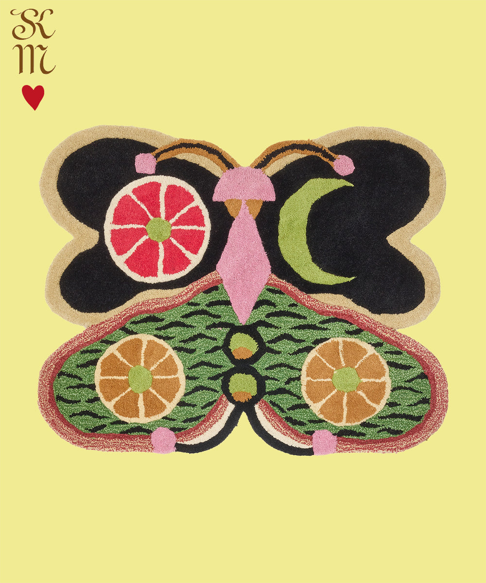 Resultatet? En serie mattor lika lekfulla och livfulla som sina naturliga motsvarigheter. Susan: ”Många av mina målningar är inspirerade av naturen, genom att förstora fjärilarnas unika egenskaper som deras små klor, färgglada vingar och mönster.”